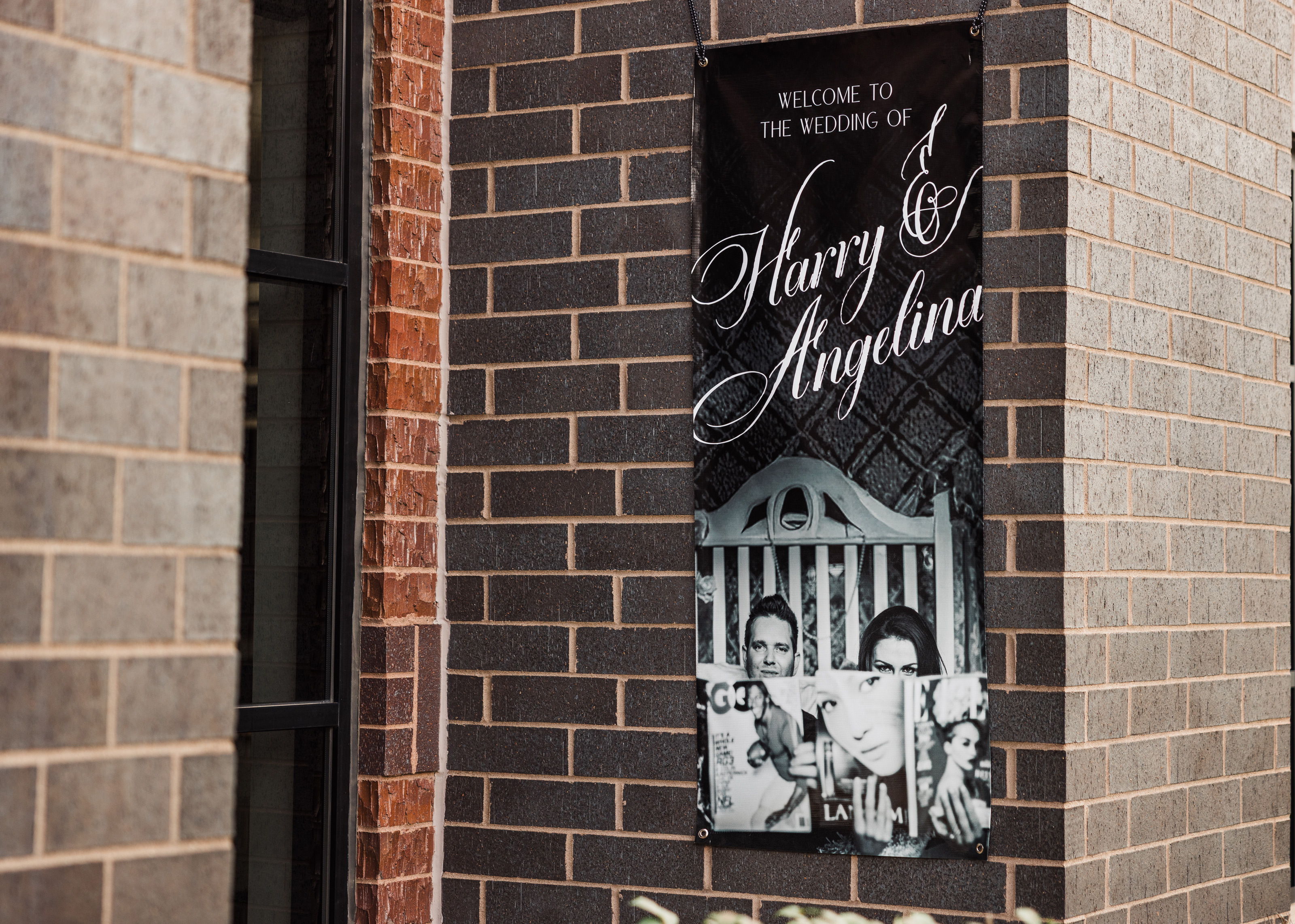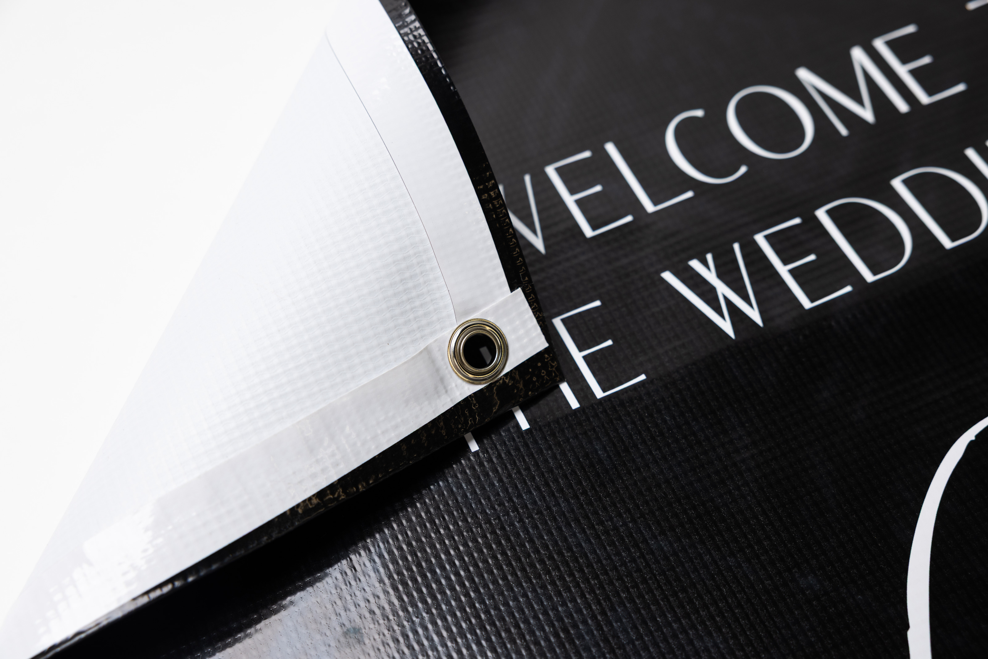 Bungees connected to silver grommets on a vertical vinyl banner printed with a messsage welcoming guests to a wedding