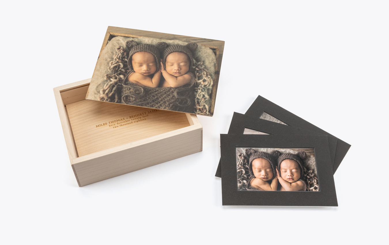 Make each box unique by selecting an image or custom design for the lid to match the prints inside, and add optional engraving with a special message or name to either side of the lid.